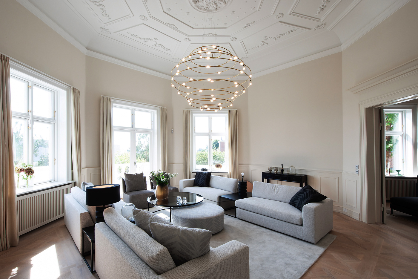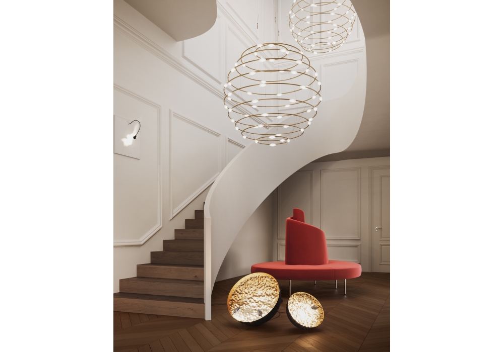 Petits Bijoux by Catellani & Smith is the representation of a “static movement”, the effect of an action that seems to imitate the gesture of throwing a stone into a body of water, thus forming concentric waves that propagate through space. The concept of the sphere, the circle as a metaphor for infinity and perfection, are dear and recurring subjects in Catellani & Smith’s thirty-year production, and they return here in this new collection of suspensions, as simple in form as they are extraordinary in execution. Shimmering lenses illuminate the natural brass rings, like celestial bodies following their orbits.