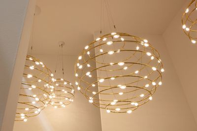 The collection consists of two different models, Petits Bijoux S and L, both characterized by a series of circles, sometimes smaller, sometimes larger, supported by thin cables, which follow one another to form a sphere (120 cm for the S model and 75 cm for the L model).