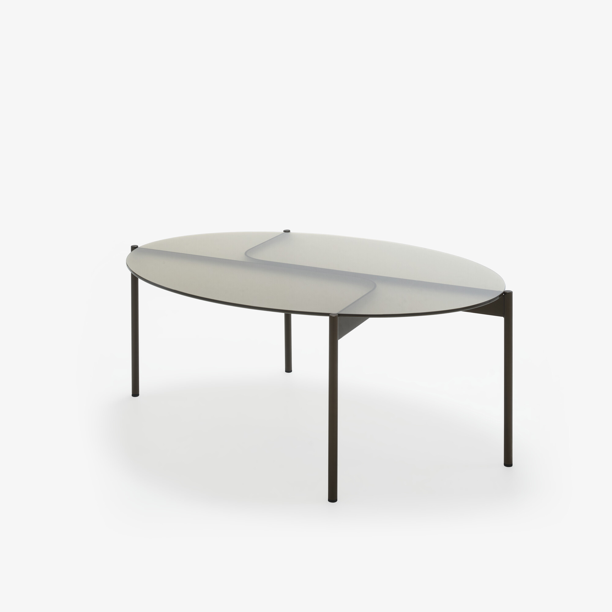 Its delicate structure, composed of slender curved “L”-shaped bands, is subtly visible beneath the tabletop, adding a discreet yet graphic dimension to the design. The tempered bronze glass top, frosted on its underside, softly diffuses light while revealing the structure with elegance.