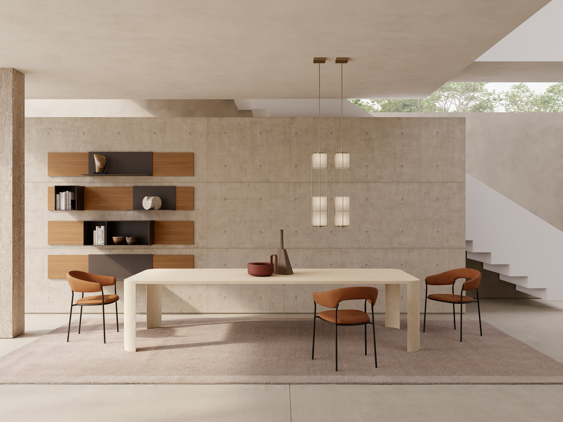 Its legs, reminiscent of softened blades, rise to embrace the tabletop, creating a dynamic tension between structure and surface. The 3 cm thick melamine top, supported by a metal frame, is hand-finished with the exclusive Coccioperla coating—a composite material made of mortar, aggregates, and crushed mother-of-pearl.
