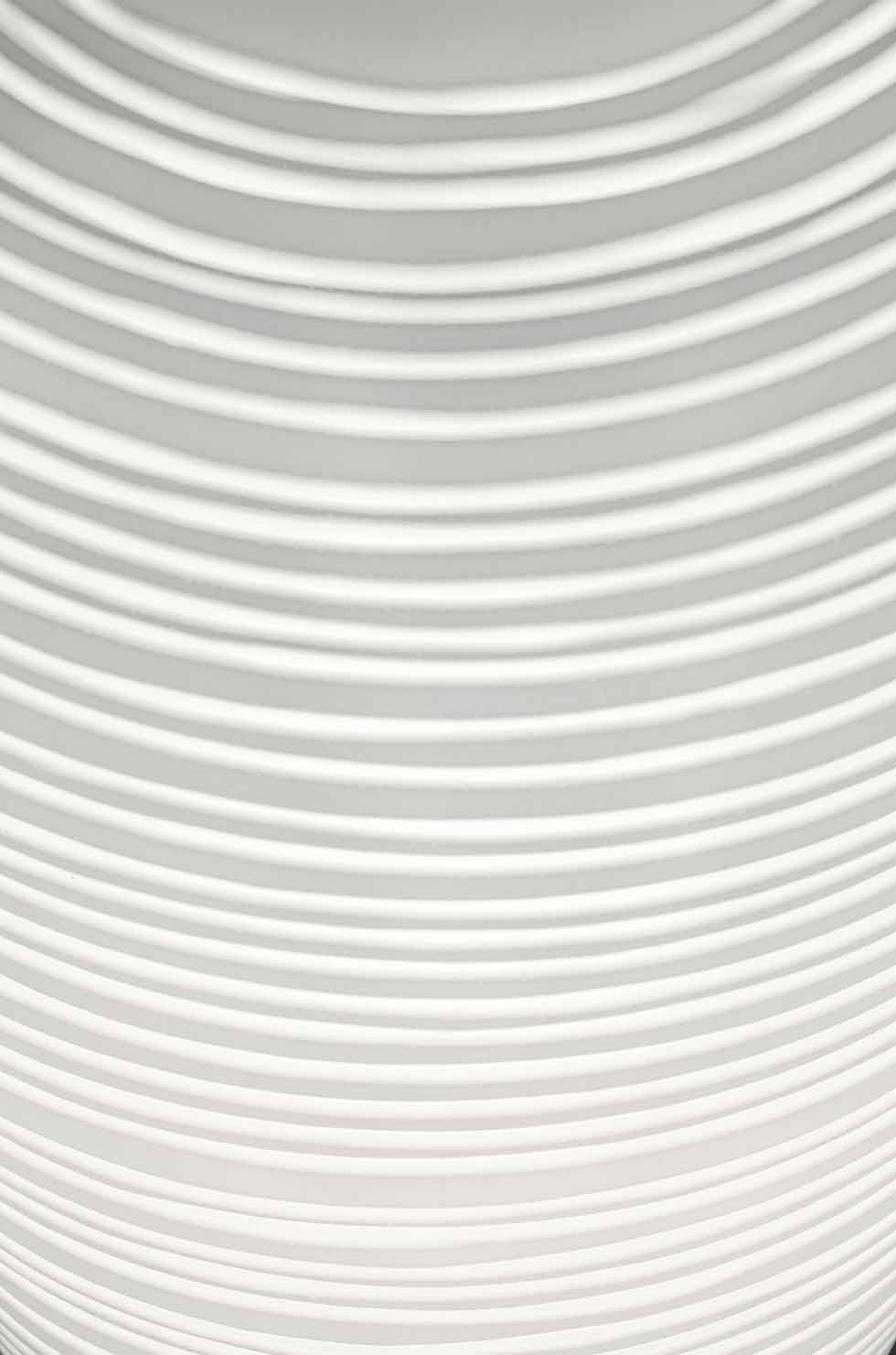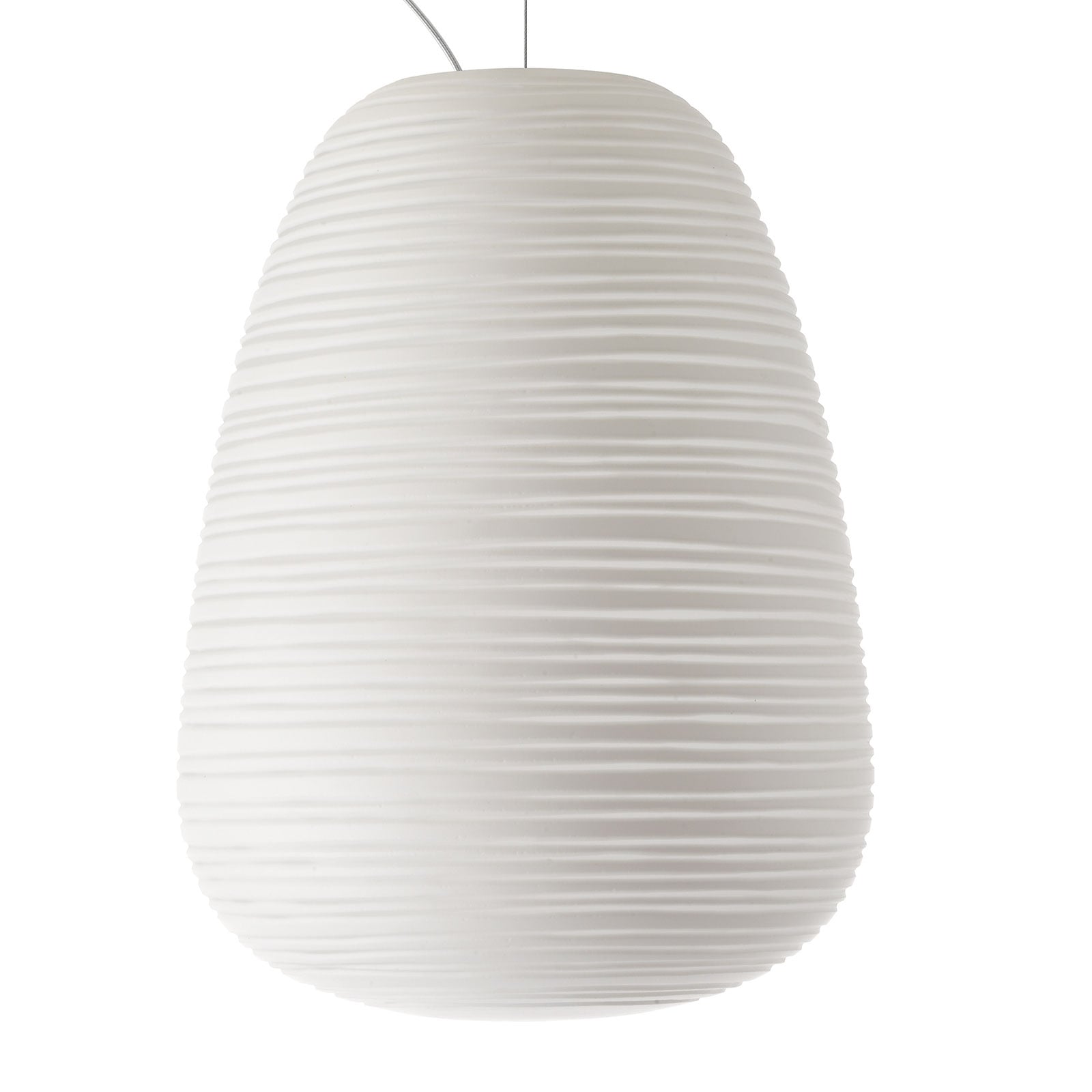 Its mouth-blown glass diffuser features delicate horizontal engravings, created through a refined artisanal process combining molding and hand-finishing techniques. This satin-like surface gently filters the light, producing a warm, even glow while adding depth and texture.