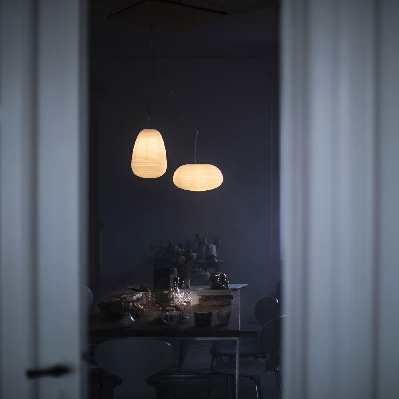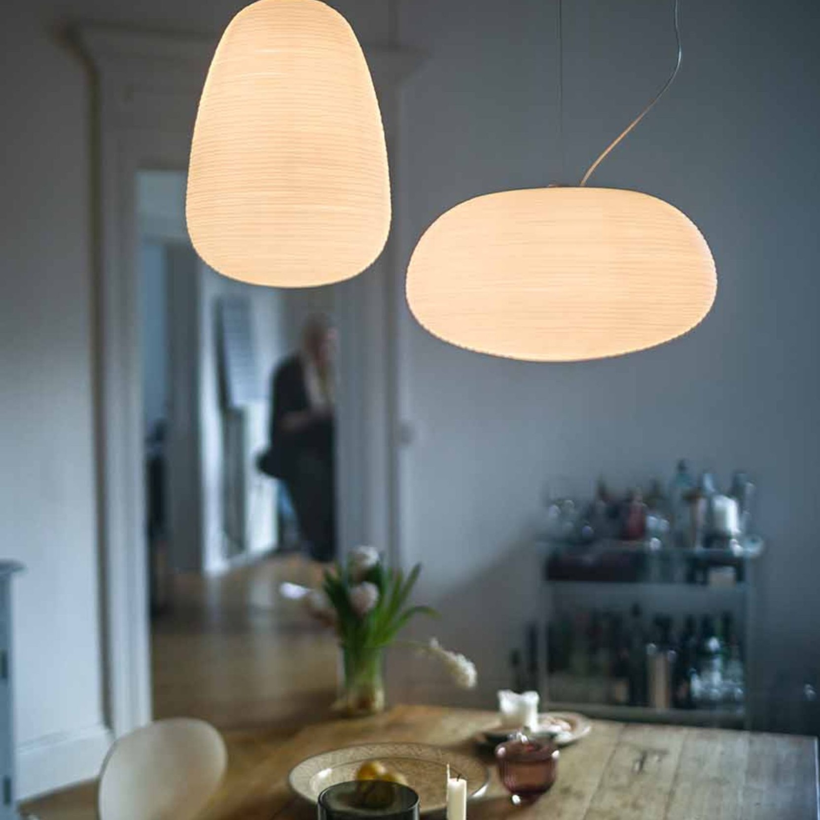 Thanks to its vertical proportions, Rituals 1 is ideal for high ceilings, stairwells, or as part of a striking multi-pendant arrangement above a dining table or kitchen island. It integrates seamlessly into contemporary interiors, bringing both visual lightness and a strong design presence.