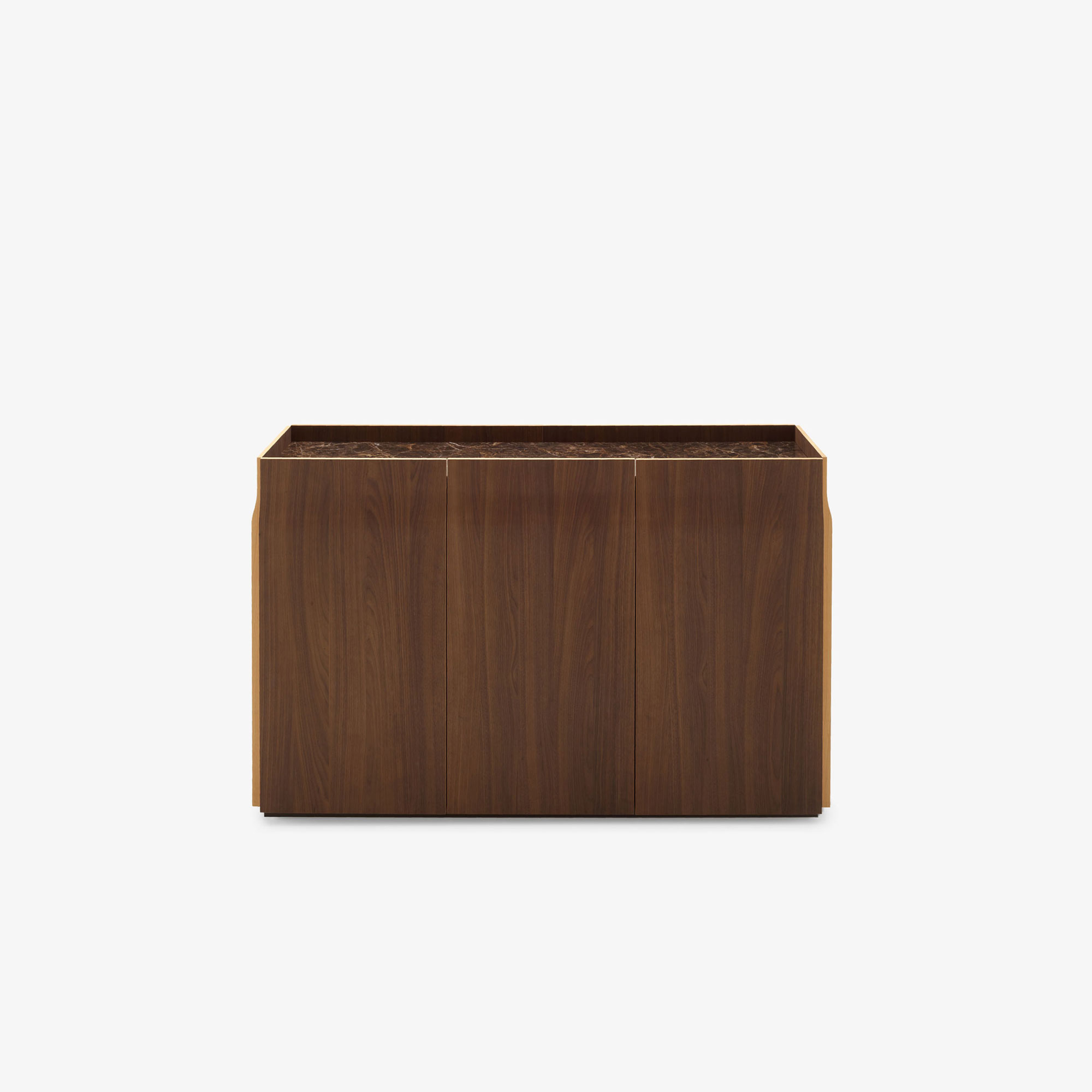 The slightly recessed top is available in white marble-effect ceramic stoneware or Emperador marble-effect ceramic stoneware, enhancing the piece’s architectural and mineral character. The dark walnut veneer on the fronts and sides adds warmth and sophistication, beautifully contrasted by a chocolate lacquered interior.