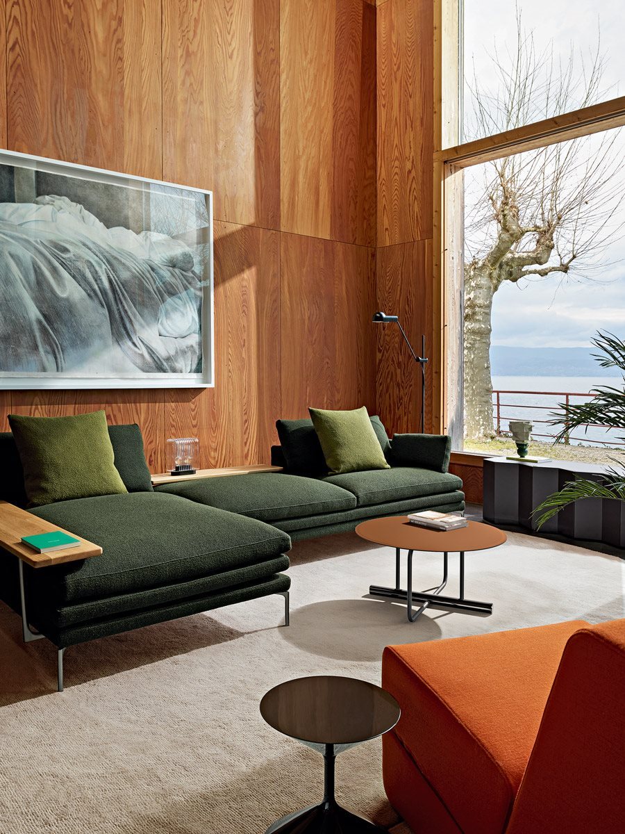 The collection includes fixed sofas, modular elements, and armless lounge chairs, which can be paired with solid wood side shelves in natural oak, grey-stained oak, or natural Canaletto walnut. Shelf supports come in polished aluminum, satin nickel (natural or black), or black lacquer—blending function and design seamlessly.
