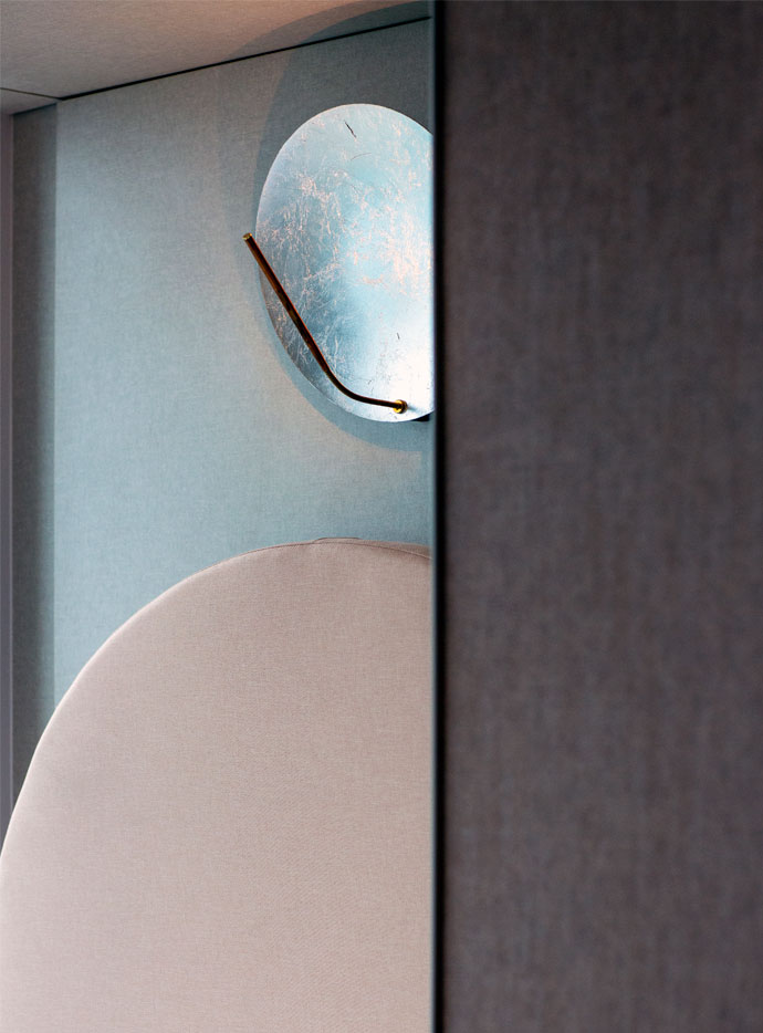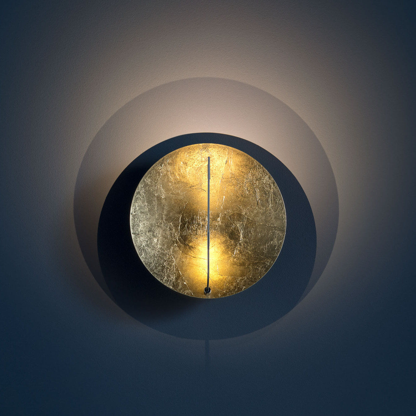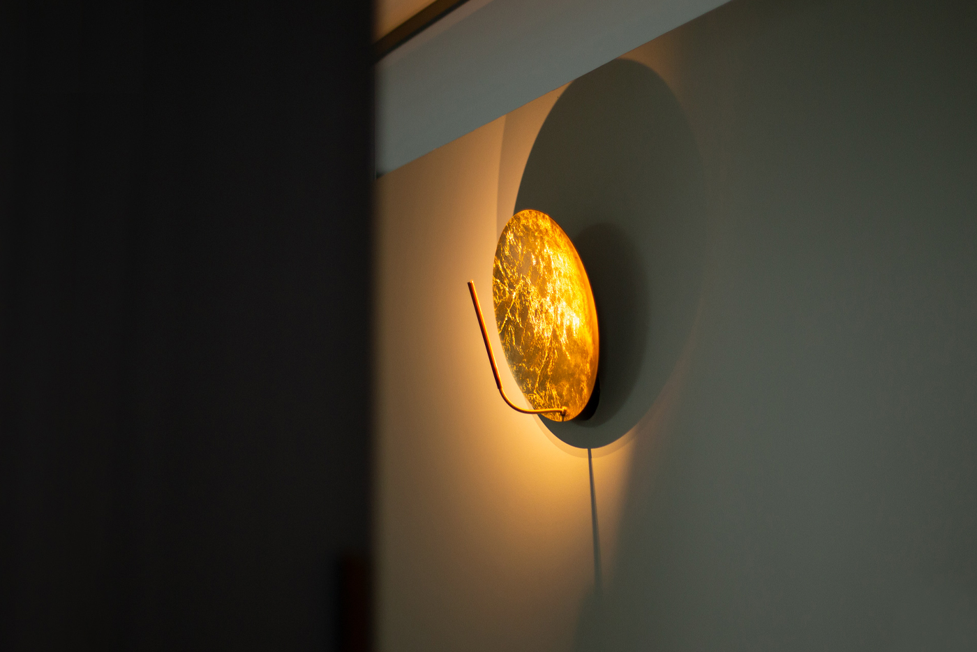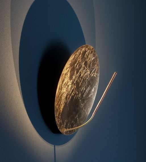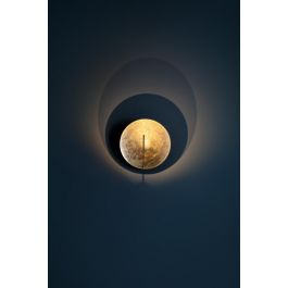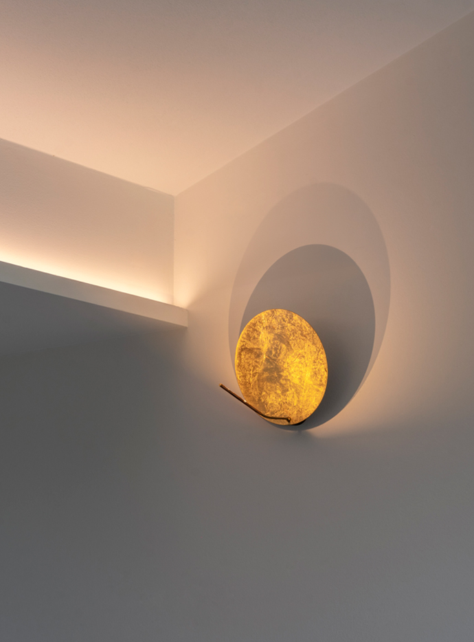 Son disque en métal, recouvert de feuille (or, argent ou cuivre), capte la lumière et la diffuse subtilement dans l’espace. Monté sur une tige en cuivre avec un bras flexible en laiton, il permet d’orienter la lumière avec précision tout en conservant une esthétique minimaliste et sculpturale.