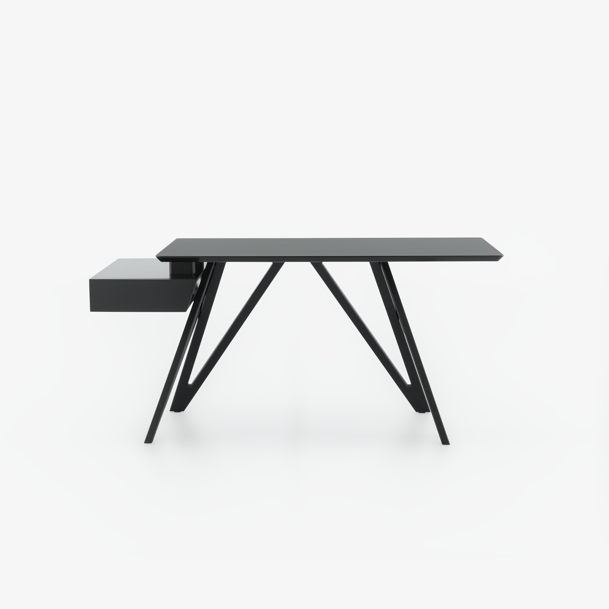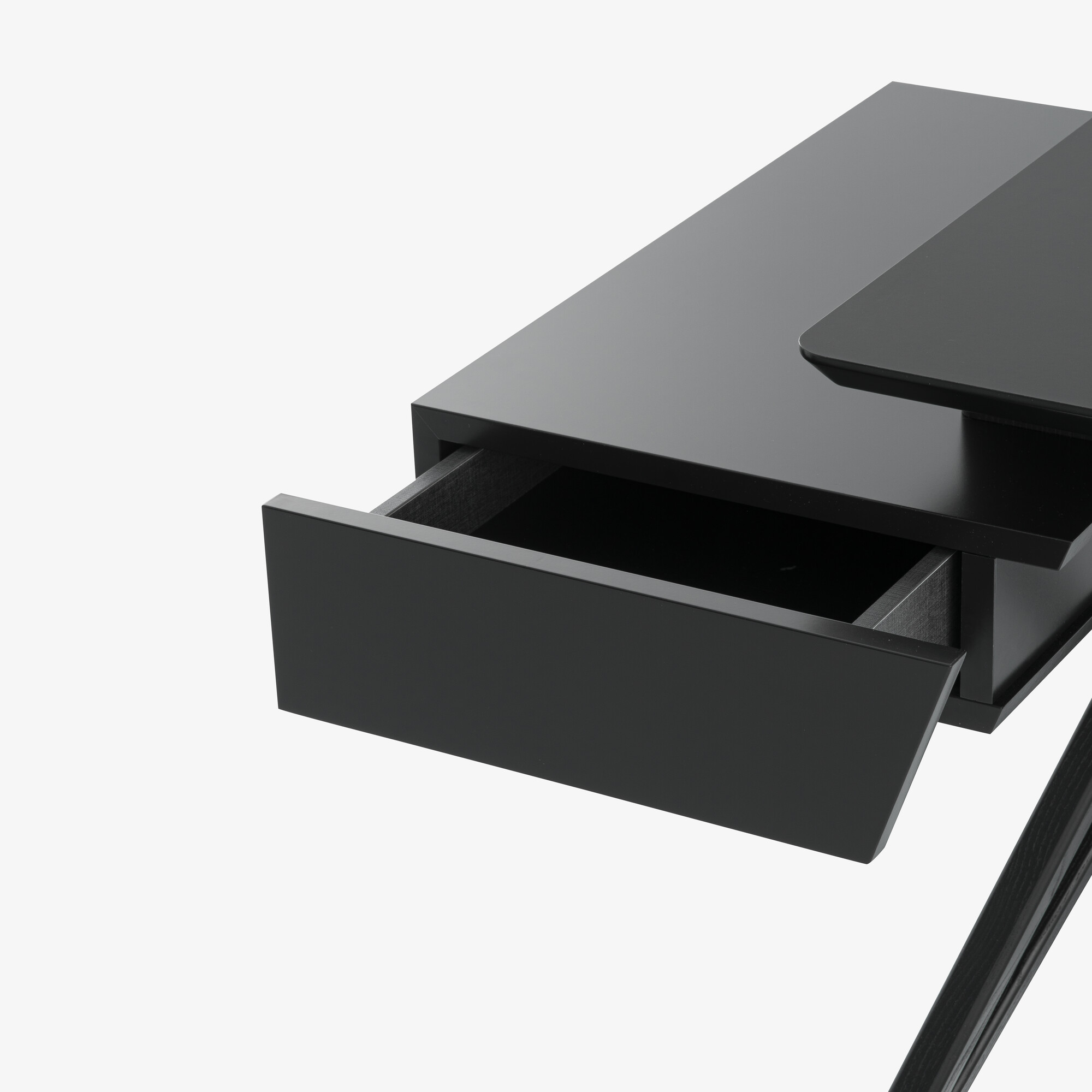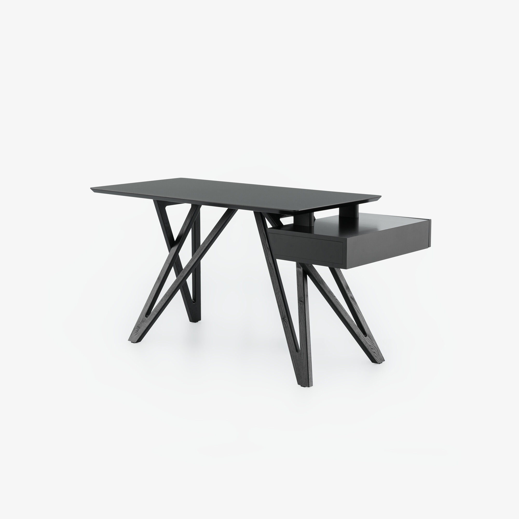 Son piétement en frêne massif teinté noir apporte stabilité et caractère, tandis que le plateau plaqué noyer naturel (ou en version stratifié noir selon finition) offre une surface de travail chaleureuse et raffinée. Le bureau intègre un coffre de rangement discret avec tiroir latéral, idéal pour organiser les accessoires du quotidien tout en conservant une ligne épurée.