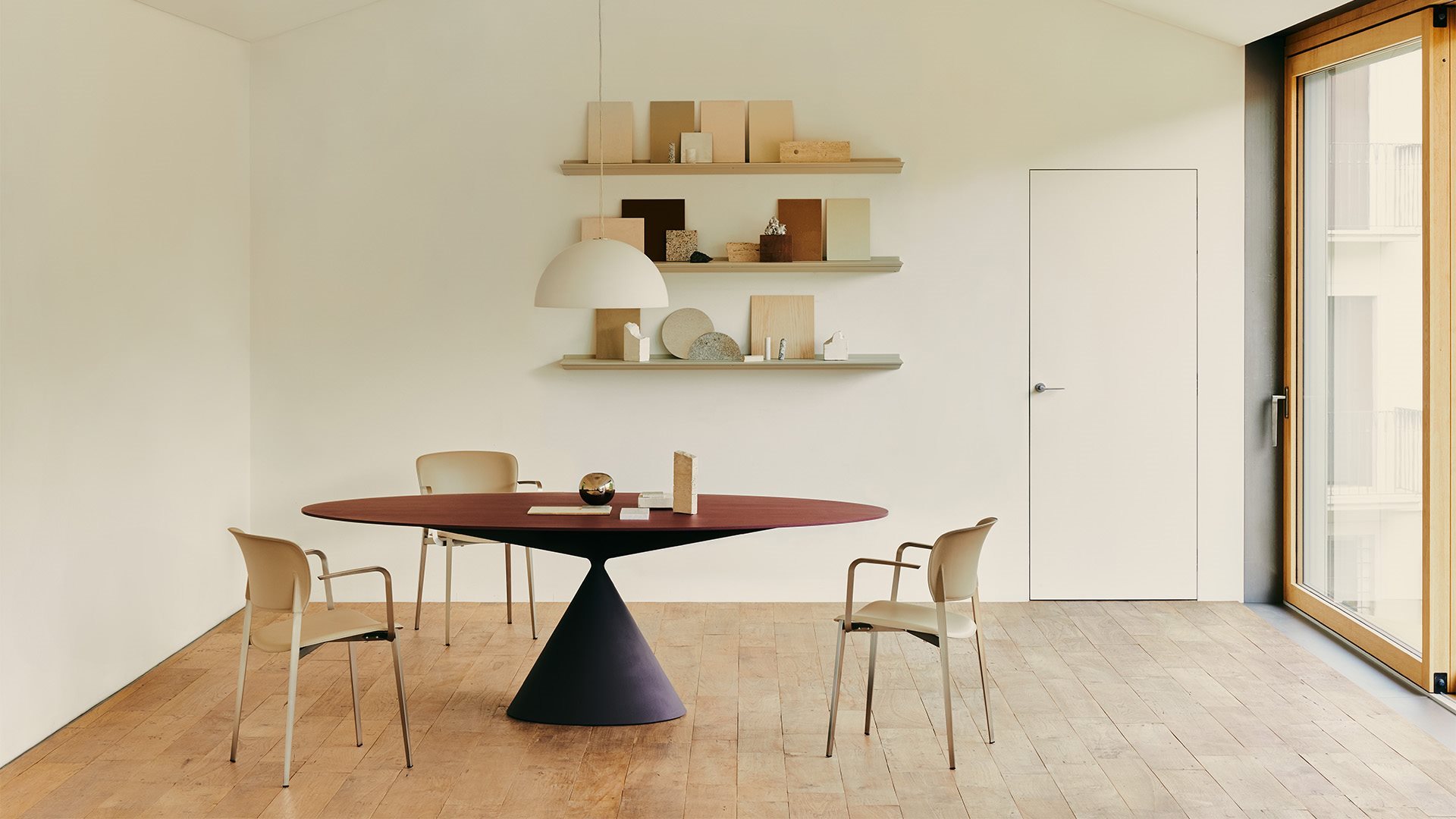 La table Clay ovale “Concrete” de Marc Krusin pour Desalto est une pièce de mobilier design qui allie sculpture contemporaine et fonctionnalité raffinée. Son profil ovale offre une présence élégante et fluide, idéale pour les grandes salles à manger, les espaces de réunion haut de gamme ou les intérieurs résidentiels contemporains où le design devient expérience. Grâce à la géométrie subtile de sa base et de son plateau, la table donne une impression de légèreté maîtrisée, comme si le plateau flottait au-dessus de son support conique emblématique.