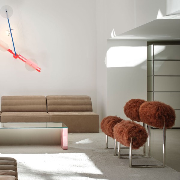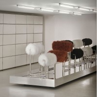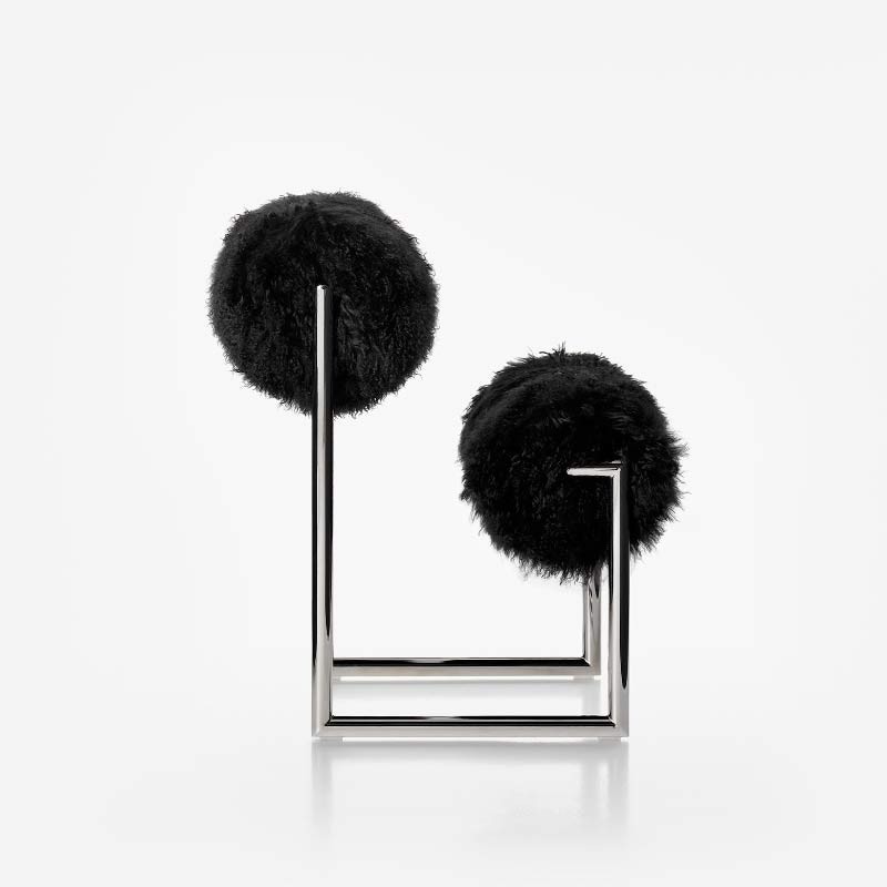 Le fauteuil Due Più, conçu par Nanda Vigo et réédité par Acerbis en 2023, est une pièce iconique du design italien des années 70. Avec sa structure tubulaire en acier chromé et ses deux rouleaux cylindriques recouverts de fourrure de chèvre de Mongolie, il exprime à la fois audace et raffinement. Ses proportions équilibrées (L. 51 × P. 54,5 × H. 72 cm) et son assise à 47 cm du sol en font un siège confortable et sculptural.