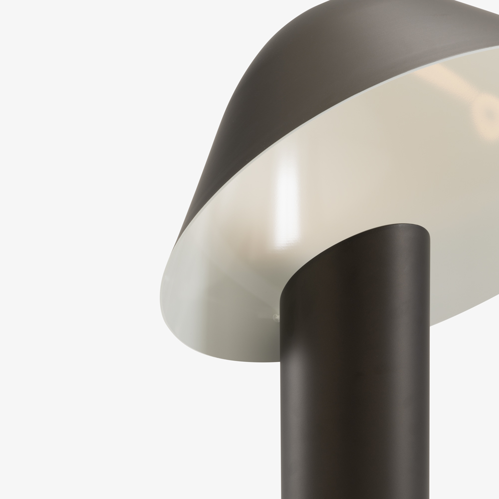 La structure du lampadaire est réalisée en aluminium, avec un large abat-jour en aluminium repoussé dont l’intérieur est laqué blanc mat, afin d’optimiser la diffusion lumineuse. La lumière est projetée vers le bas et réfléchie à l’intérieur de l’abat-jour pour offrir un éclairage indirect doux et confortable, idéal dans un salon, près d’un canapé ou dans un espace de lecture.