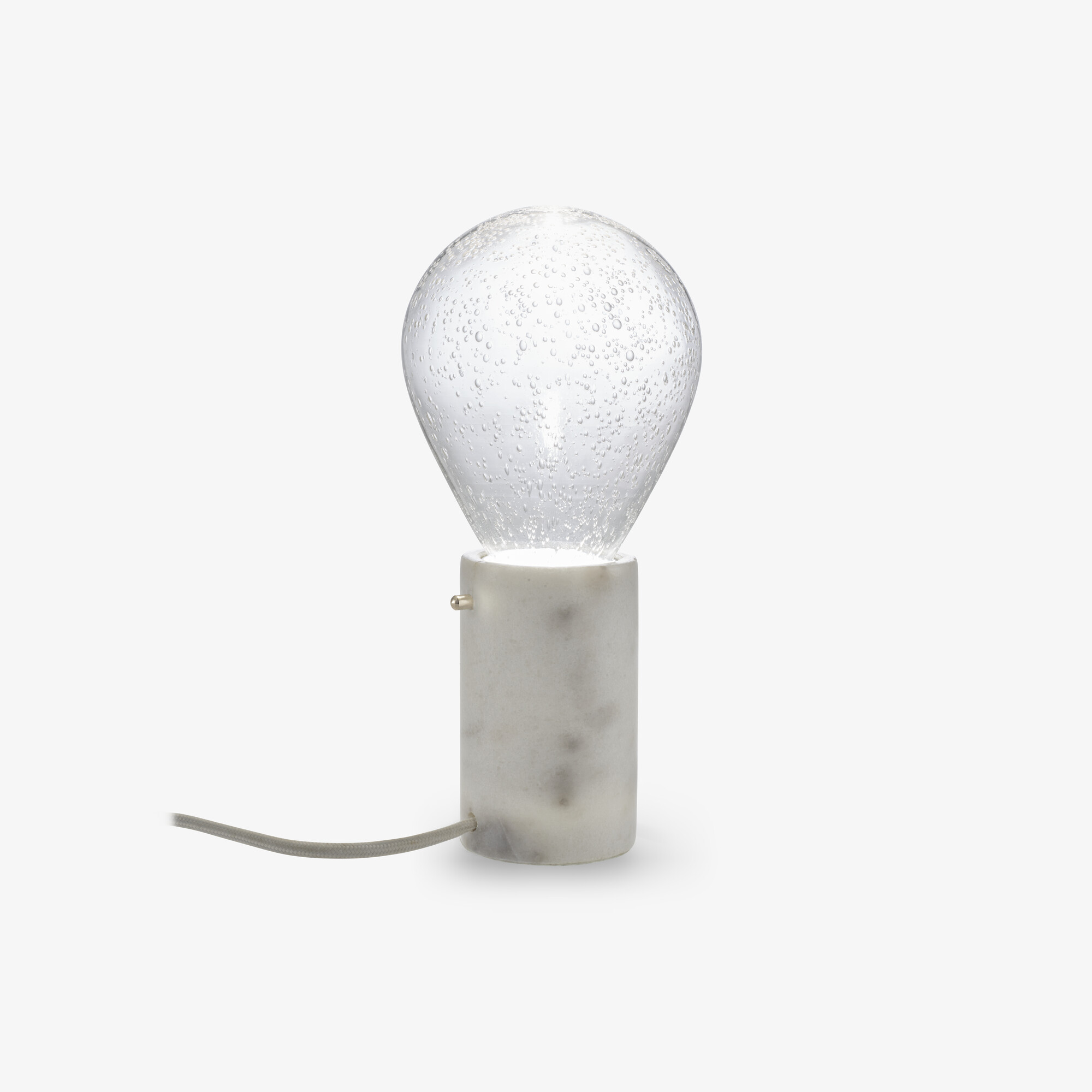 Lampe à poser avec une base cylindrique en marbre blanc (Ø 7 H 11 cm), surmontée d’une verrerie soufflée bouche en forme de goutte renversée, décor bulles. Câble électrique textile blanc. Interrupteur à main blanc.