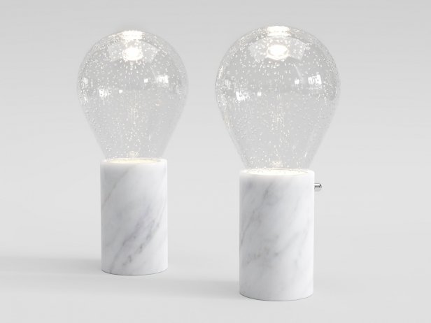 La lampe repose sur une base cylindrique en marbre blanc, qui apporte stabilité et élégance, et supporte un abat-jour en verre soufflé bouche en forme de goutte inversée. La présence de fines bulles dans le verre enrichit la matière et permet une diffusion douce et chaleureuse de la lumière, créant une atmosphère intime et apaisante.