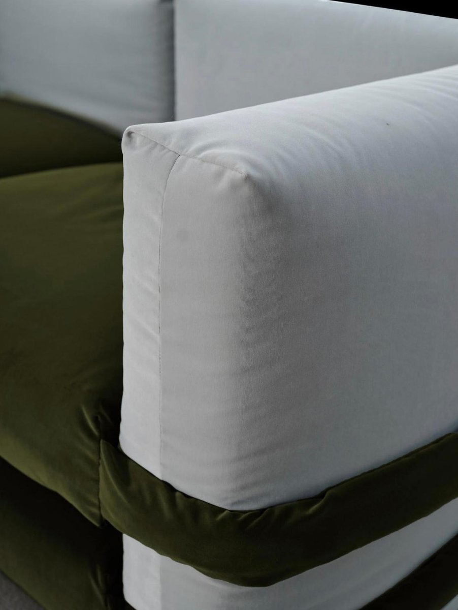 Nous vous proposons ici le modèle « Velvet » dans sa version aux coussins d’assise bicolores vert/blanc.
