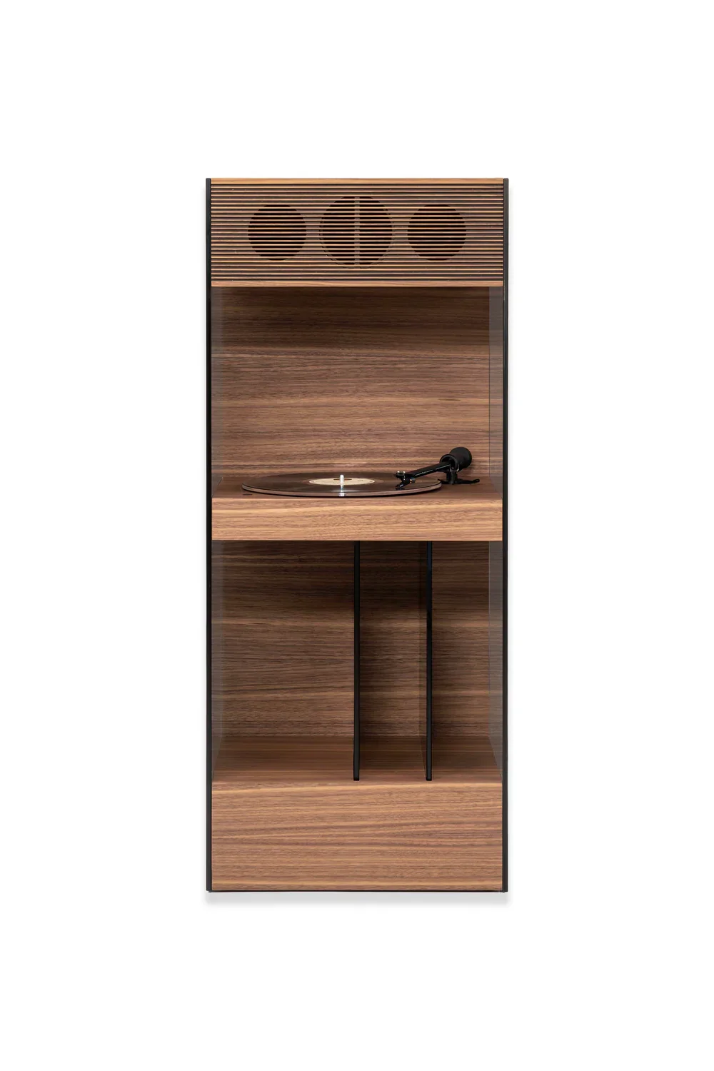 Imaginé en collaboration avec Iratzoki Studio, le PR ALTA séduit par son architecture verticale aérienne composée de trois niveaux reliés par des panneaux en verre trempé fumé. Son style minimaliste et intemporel s’intègre parfaitement dans un salon moderne, un bureau premium ou un espace musique dédié.