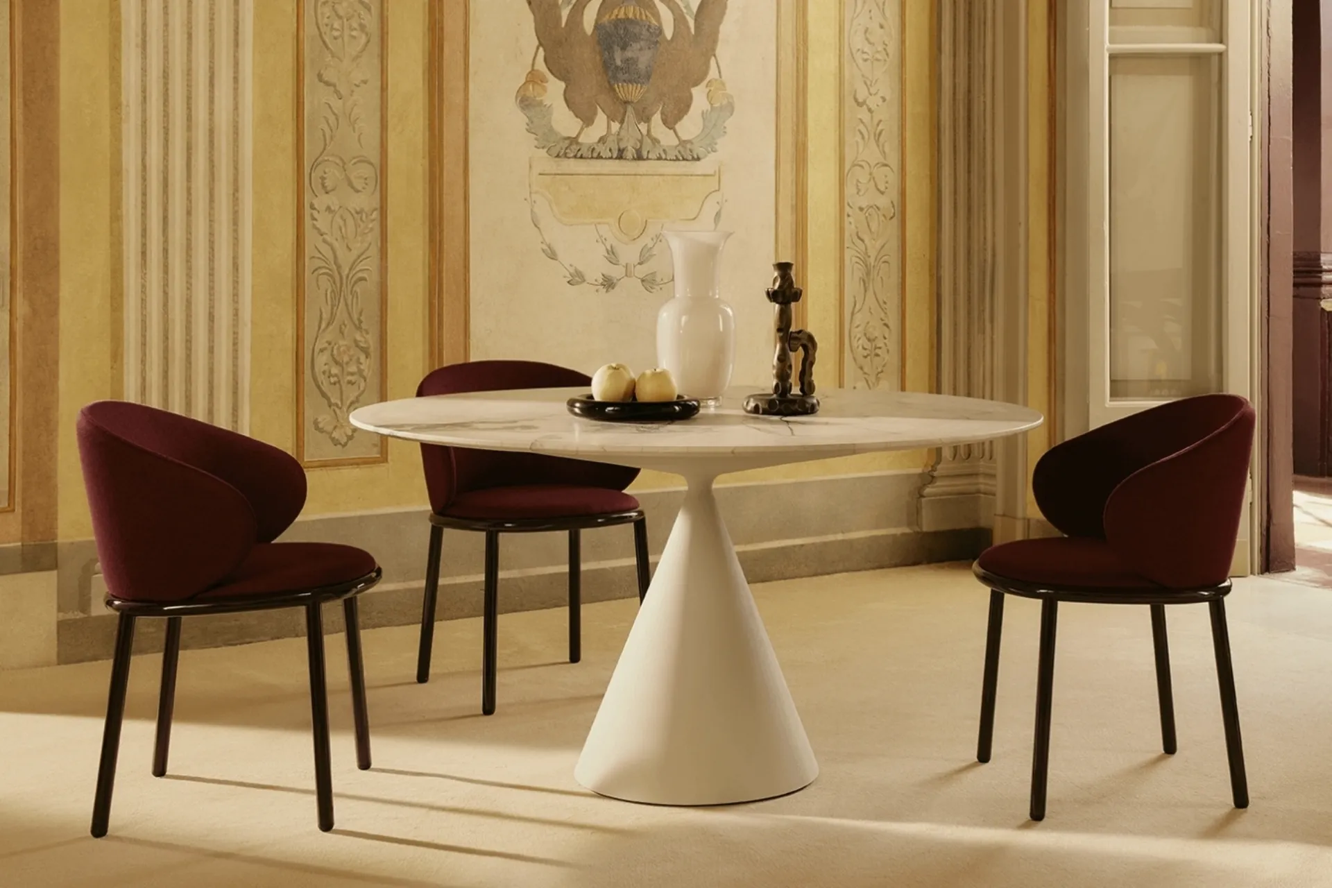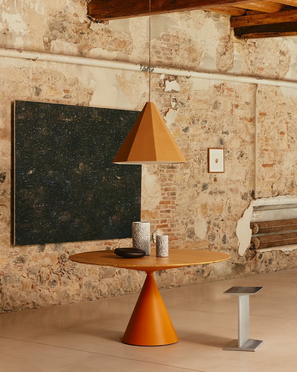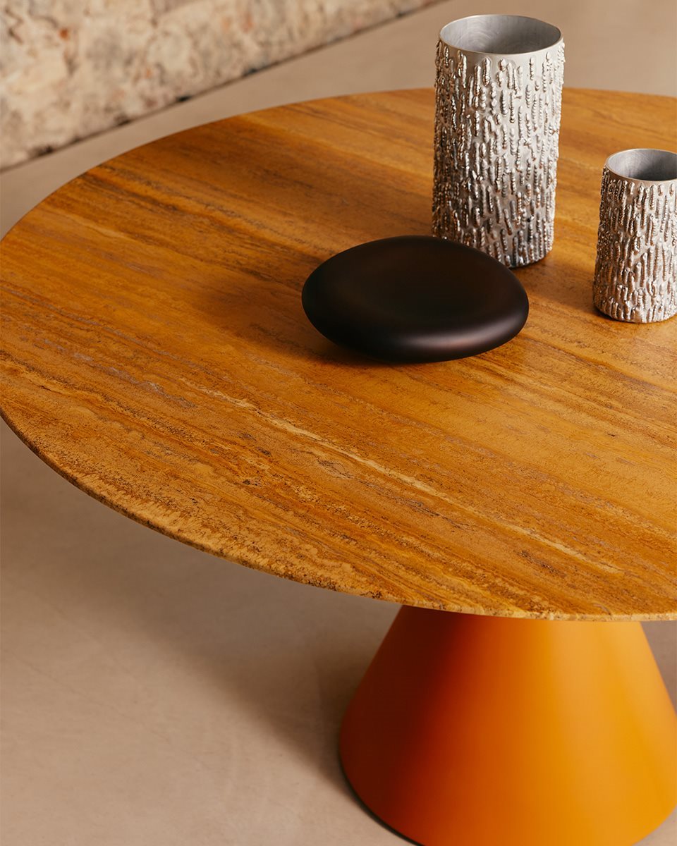 La table Clay avec plateau en marbre est proposée exclusivement en diamètres Ø 120 cm et Ø 140 cm, avec une hauteur d’environ 74,5 cm, des proportions idéales pour une salle à manger contemporaine ou un espace de réception élégant. Sa base conique de 50 cm de diamètre, réalisée en polyuréthane rigide, garantit une excellente stabilité tout en renforçant le caractère sculptural du design.